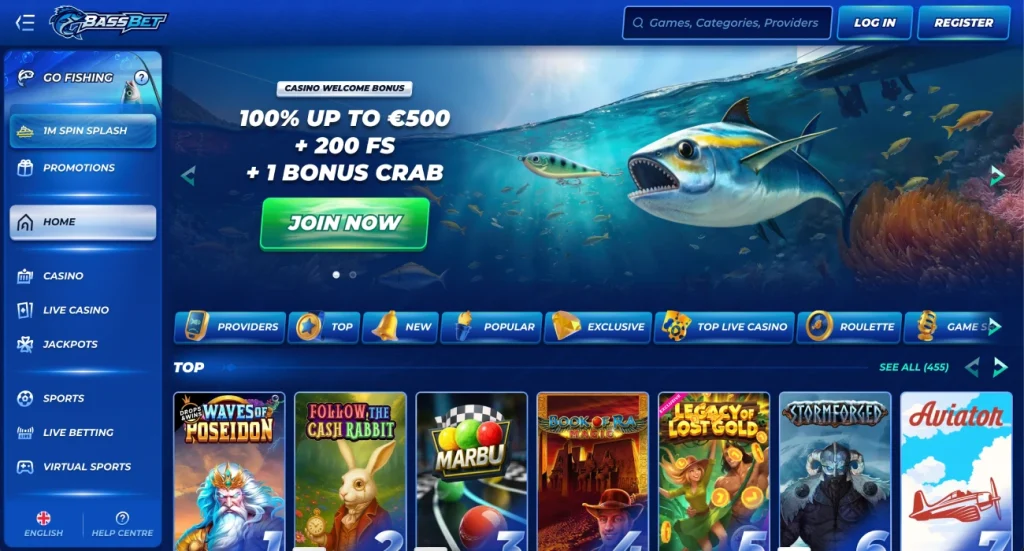عند وصولك إلى الصفحة الرئيسية لموقع Bassbet كازينو، ستجد لوحة ألوان جذابة وتصميمًا بديهيًا يُشير فورًا إلى الاحترافية والموثوقية. في حين تُغرق العديد من الكازينوهات الإلكترونية زوارها الجدد بوابل من الإعلانات، يُحقق Bassbet توازنًا بين لافتات ترويجية نابضة بالحياة وقوائم واضحة وسهلة الاستخدام. تُعلن اللافتة العلوية للموقع بفخر عن باقة ترحيب سخية – تصل إلى 500 دولار أمريكي كمكافأة، و200 لفة مجانية، وهدية “Bonus Crab” المسلية – مُصممة لجذب اللاعبين من جميع مستويات الخبرة.